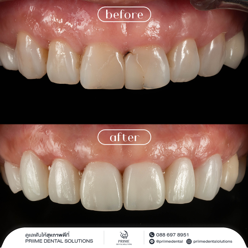 เนื่องจากมีปัญหาฟันซี่เล็ก เนื้อฟันบาง และฟันหน้าร้าว หากปล่อยไว้นานอาจลุกลามจนกระทบถึงรากฟัน แฟนจึงแนะนำให้เข้ามาปรึกษาที่นี่ คุณหมอตรวจพบว่าฟันร้าวอยู่ในระยะที่ 2 และแนะนำให้รักษาด้วยการทำเซรามิกวีเนียร์ เพื่อเสริมความแข็งแรงให้ฟัน พร้อมปรับรูปร่างให้ดูสวยงามยิ่งขึ้น